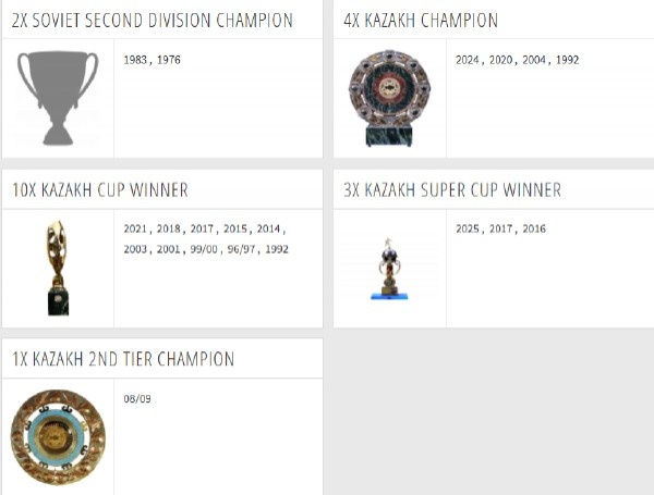 阿拉木图凯拉特一共赢下过4次哈萨克斯坦超等联赛冠军,最近的一次是在2024年。他们不单是拿到了联赛冠军,还包揽了国内杯赛,树立双冠王。这亦然1992年之后,球队再一次取得这么的树立。