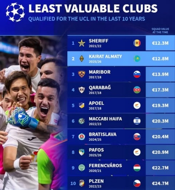 要是用德回身价来对比,以至还能更直不雅。中超球队申花的德回身价是1383万欧元,打入欧冠正赛的阿拉木图凯拉特的德回身价是1273万欧元。