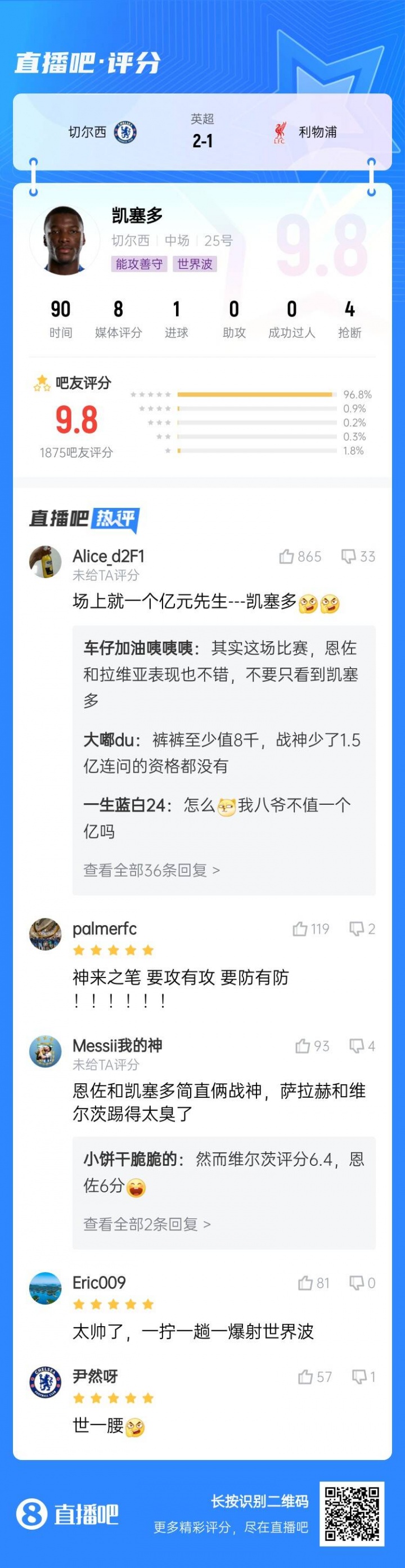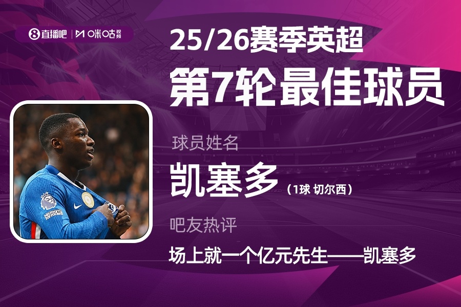 2025-2026赛季英超火热进行中,和咪咕体育调解髻起每轮英超最好球员评比活动!第7轮评比效力出炉,切尔西后腰凯塞多攻防兼备,轰入寰宇波匡助切尔西2-1战到手物浦,赢得吧友5.6万票的撑抓,当选 【X咪咕体育英超第7轮最好球员】!
