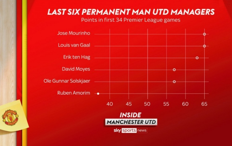 10月9日讯 加盟曼联以来,阿莫林依然率队踢了34场英超比赛,但他的捏教弘扬远远没能达到外界的祈望。左证太空体育的数据统计,阿莫林前34场英超比赛只是拿到37分,低于之前数位曼联主帅所拿到的积分。