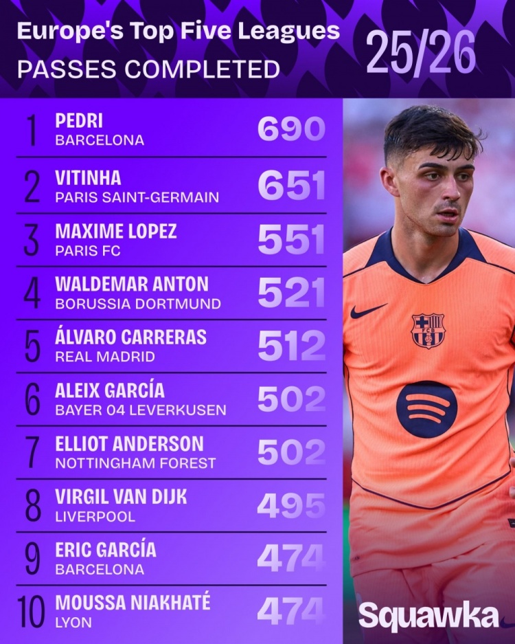 10月17日讯 Squawka统计了本赛季到当今已矣欧洲五大联赛球员传球次数名次,巴萨中场佩德里完成690次传球位居榜首,巴黎中场维蒂尼亚651次排在第二位。