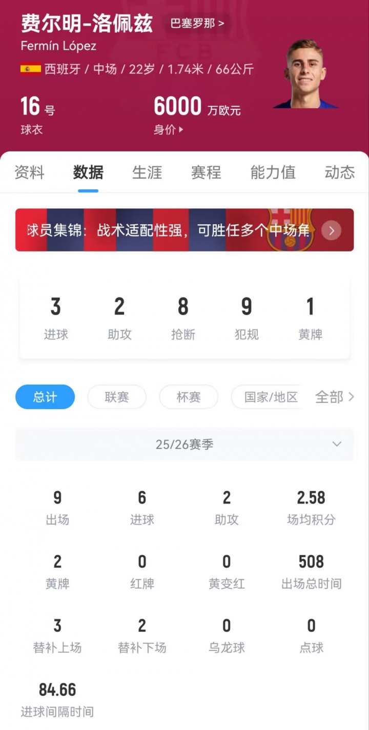 在一个月前更新的德转西甲球员最新身价中,费尔明的身价高潮1000万,来到6000万欧元,刷新个东说念主生计新高。