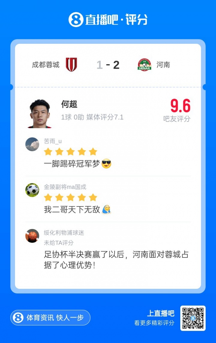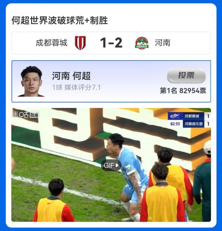 【】中超第29轮最好评比恶果出炉,河南队中场何超当选!本轮中超,何超轰入一记天下波,匡助河南客场2-1逆转成齐蓉城,粗疏个东谈主两年球荒的同期,掐灭了蓉城的争冠但愿!