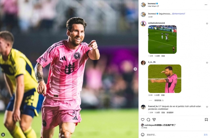 梅西本场2球1助率队晋级,下轮迈阿密国外对阵辛辛那提。赛后梅西更新ins写谈:咱们络续冲@迈阿密国外