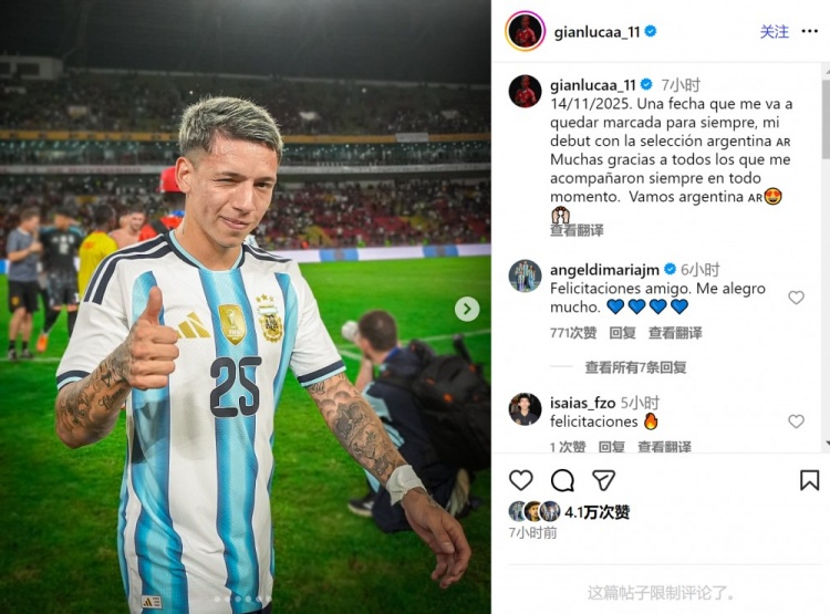 普雷斯蒂亚尼社媒晒出像片,庆祝完成阿根廷队首秀,配文:“2025年11月14日。这个日子将持久记得在我心中,我代表阿根廷国度队完成首秀。赤忱感谢一谈以来复古我的统统东谈主,阿根廷加油!”