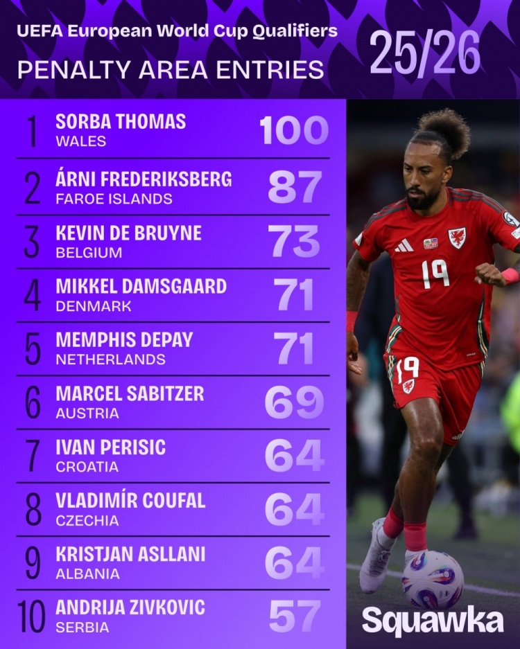 11月20日讯 本届世欧预小组赛依然告一段落,squakwa也统计了本届赛事插足禁区次数情况,威尔士边锋索尔巴·托马斯领跑。