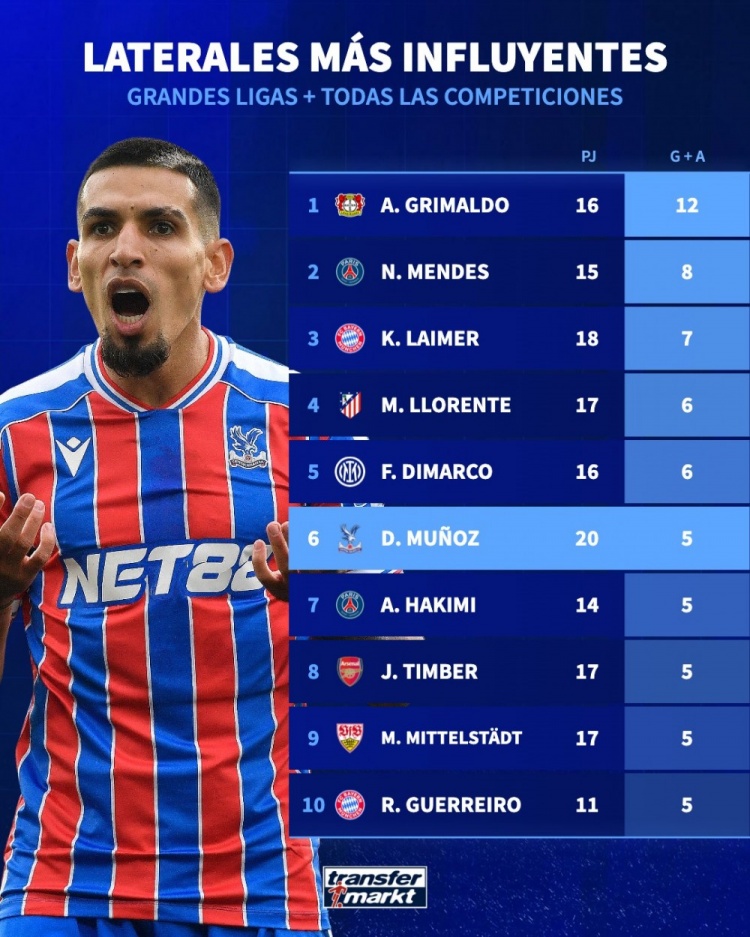 11月25日讯 德国转会阛阓统计了本赛季五大联赛边卫的参与进球数目,并排出榜单,格里马尔多参与12球居首,努诺·门德斯参与8球次席。