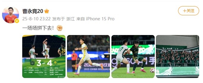 赛后,北京国安球员曹永竞更新了个东说念主社媒,他晒出多张比赛相片,并写说念:“一场场拼下去!”