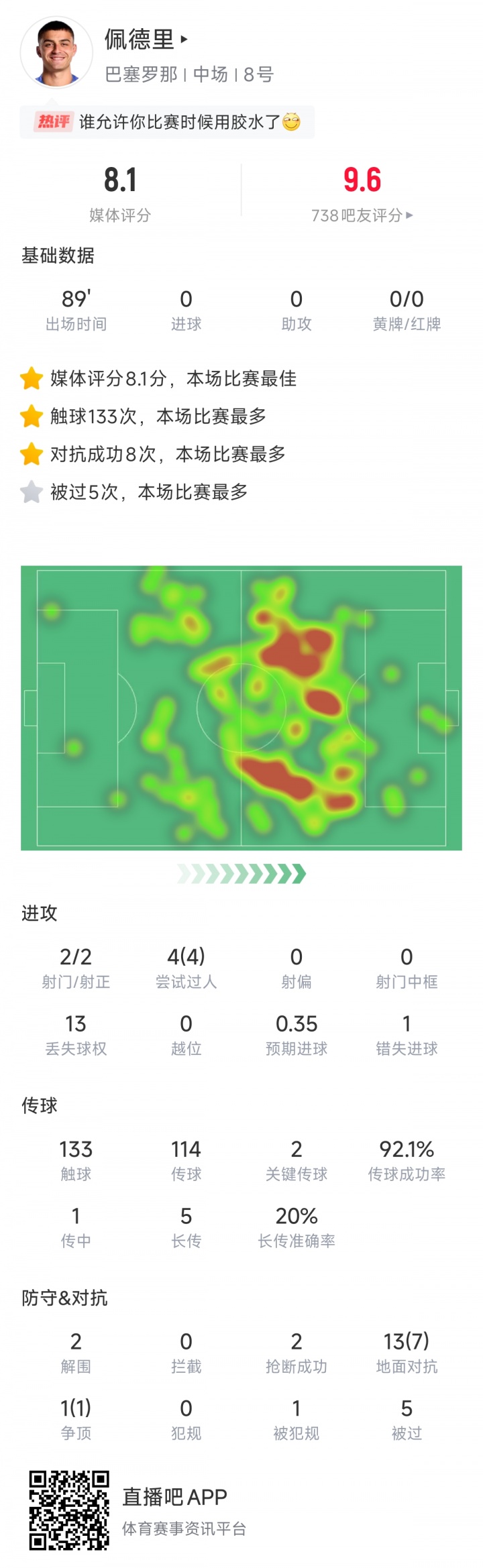 佩德里本场比赛依旧是孝顺极为逆天的数据。133次触球冠绝全场,这其中他有4次过东说念主一说念得手,14次抵拒8次得手,114次传球92.1%得手率,2要津传球2突围2抢断。5次被过是他唯独的劣势数据。热门图袒护通盘这个词中场的佩德里,已成巴萨弗成或缺的引擎。