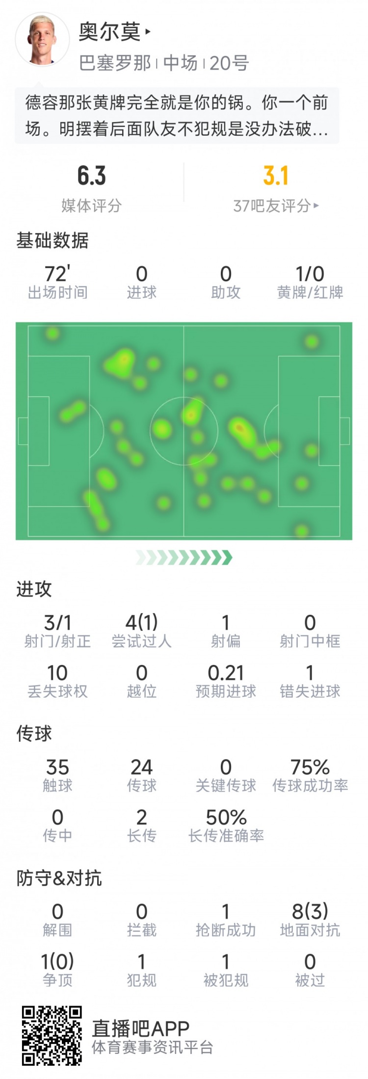 10月2日讯 在本轮欧冠巴萨对阵巴黎的比赛中,奥尔莫首发出场,以下为他在本场数据: