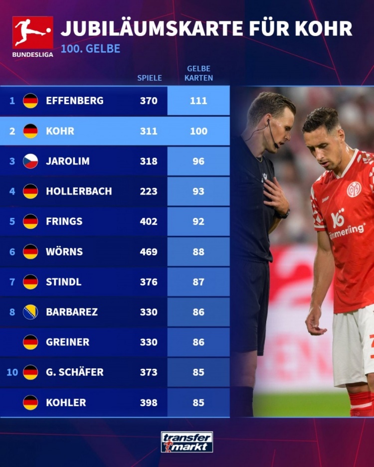 德甲历史黄牌数目名次: