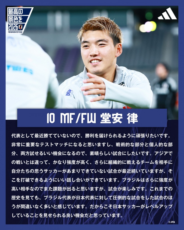 10月14日讯 北京本领今晚18:30,海外友谊赛日本队将在主场迎战巴西队。日本国度队官推更新,晒出昨日教师后堂安律禁受采访的试验。