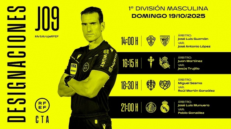 10月19日讯 西班牙足协官方公布了西甲第9轮部分比赛场次的裁判安排,穆努埃拉规矩皇马客战赫塔费。
