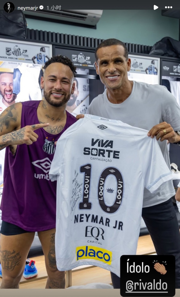 本场比赛内马尔替补登场迎来复出,赛后内马尔也在社媒晒出与巴西名宿里瓦尔多的合影,并施济签名球衣,配文写说念:“偶像里瓦尔多!”