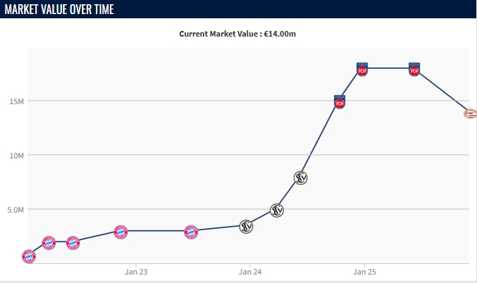 12月03日讯 昨晚德转更新了荷甲球员的身价,今夏从拜仁转会至埃因霍温的19岁小将万纳尔身价下降400万欧,现身价1400万欧。