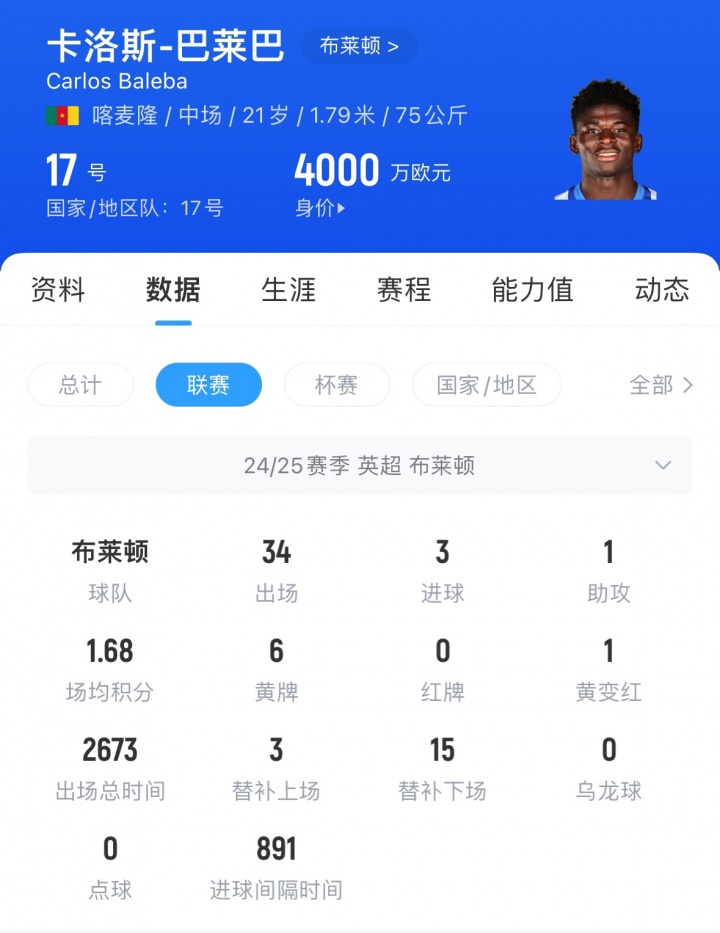 巴莱巴现年21岁,身高1米79,左脚球员司职后腰,他与球队现有合同在2028年到期,另有一年续约选项。巴莱巴德转现估值4000万欧。