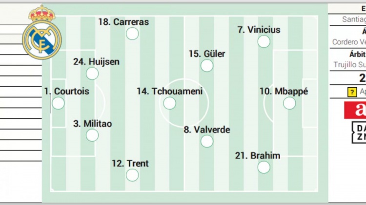中场的亮点在于巴尔韦德回归,他因右腿肌肉超负荷缺席了对阵蒂罗尔的友谊赛。他的中场搭档将是居勒尔,后者在皇马的未来将转型为中场核心,必要时也可出任右边锋。琼阿梅尼坐镇中场,组成全新的中场三人组。