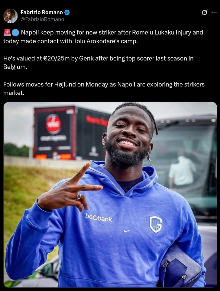 8月19日讯 据知名转会专家罗马诺报道,在卢卡库受伤之后,那不勒斯正在寻找新的前锋,今日他们与亨克前锋阿洛科达尔取得联系。