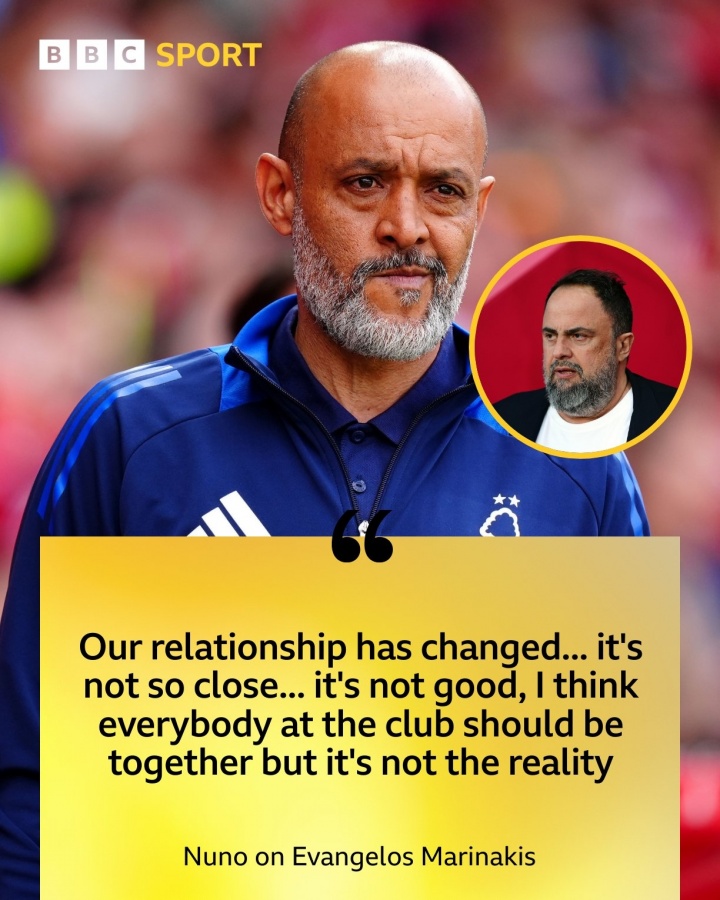 08月22日讯 今日有消息称,由于与老板之间的转会分歧,诺丁汉森林考虑解雇主帅努诺。而今日努诺在发布会上承认了与老板关系恶化。