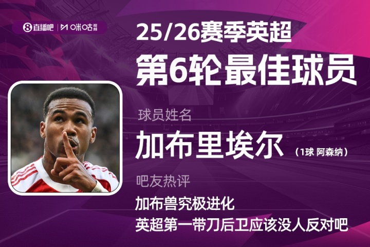 2025-2026赛季英超火热进行中,和咪咕体育联合发起每轮英超最佳球员评选活动!第六轮评选结果结出炉,加布里埃尔头球绝杀,帮助阿森纳2-1战胜纽卡斯尔,获得吧友8万票的支持,力压哈兰德当选 【X咪咕体育英超第6轮最佳球员】!