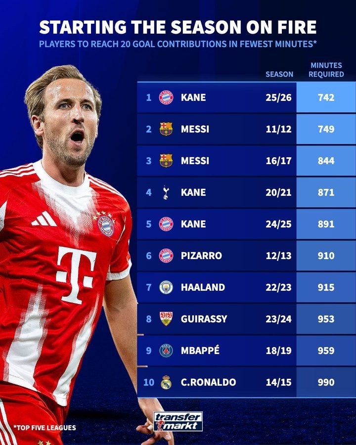 本赛季开局,凯恩仅用742分钟时间就为拜仁造了20个进球(进球+助攻),比2011年的梅西快了7分钟,刷新历史。