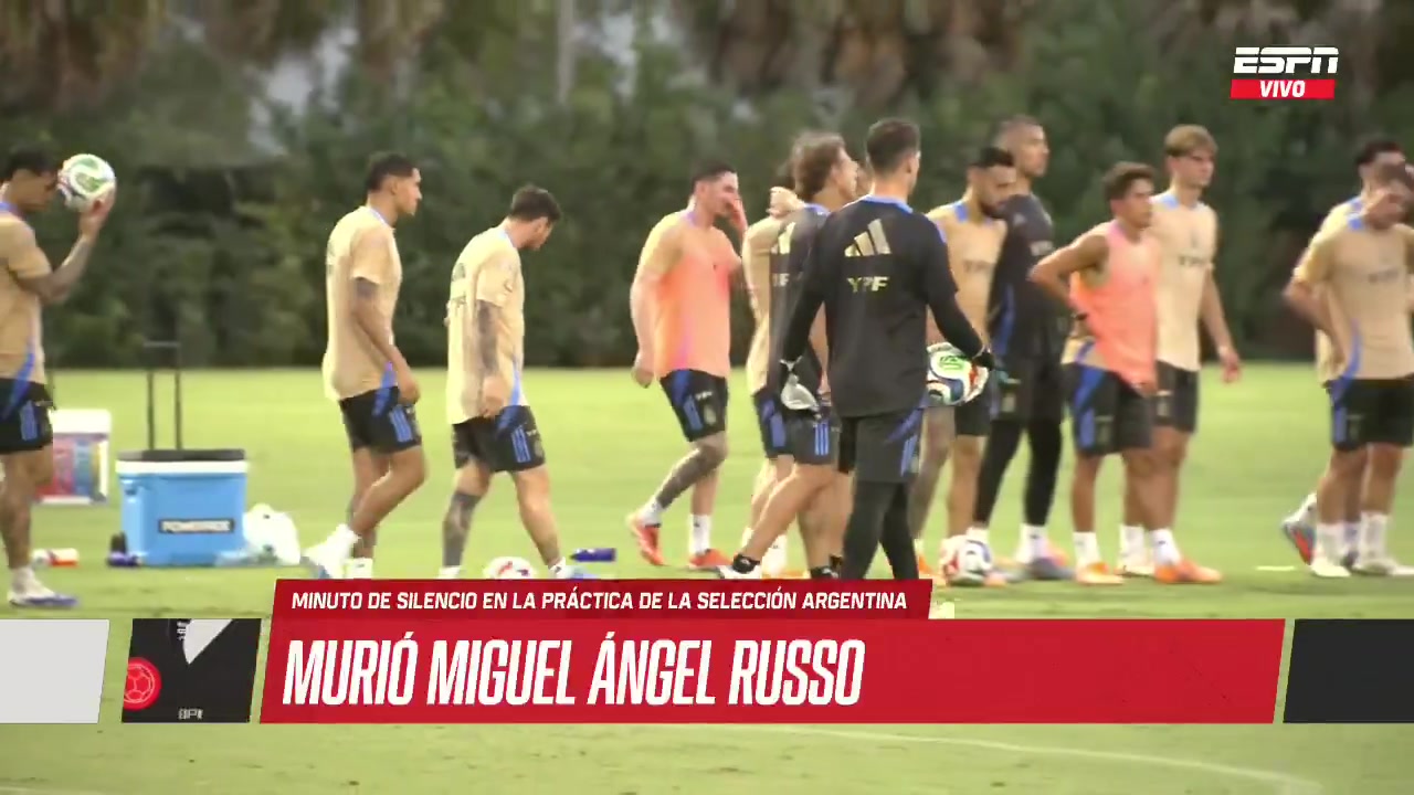 阿根廷队正在迈阿密备战友谊赛,球队在训练场上进行默哀仪式,以悼念去世的鲁索。