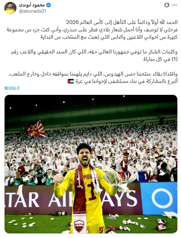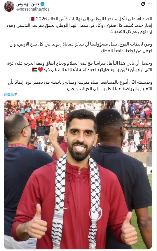 今日,卡塔尔国门马穆德-阿布纳德也发文:“我以国家队队长海多斯为榜样,无论在场上场下他都始终以行动激励着我们,我将捐款为加沙的兄弟们建造一所医院。”