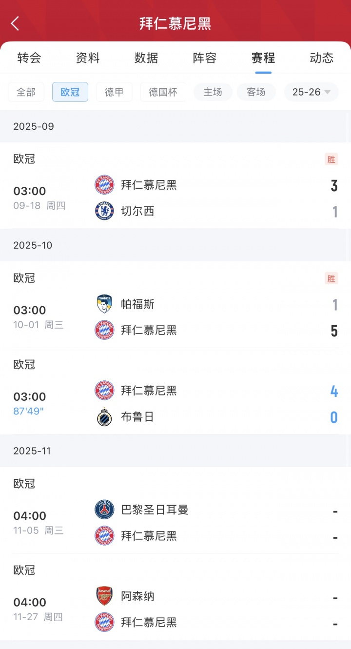 10月23日讯 北京时间10月23日星期四,欧冠联赛阶段第3轮,拜仁4-0轻取布鲁日迎来欧冠3连胜!拜仁开赛3轮欧冠打进12球(3-1切尔西、5-1帕福斯、4-0布鲁日),未来两轮将会分别对阵巴黎和阿森纳!