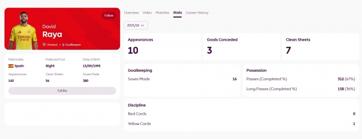 此后的9轮联赛里,拉亚共做出9次扑救,场均扑救数为1次。近4轮英超联赛,阿森纳甚至只被对手射正1次。