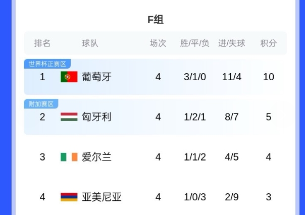 F组形势:C罗带领的葡萄牙只要战胜爱尔兰便能锁定小组头名,晋级世界杯;如果先开始的比赛中,匈牙利未能击败亚美尼亚,那么葡萄牙平局就可锁定头名。