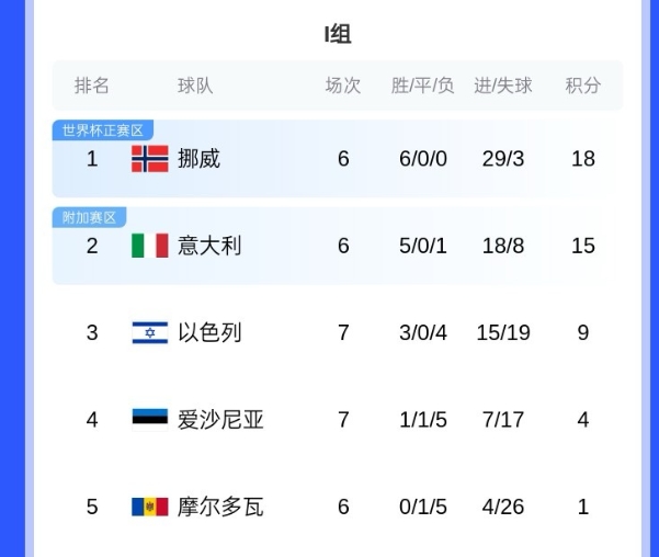 如果挪威击败爱沙尼亚且意大利未能战胜摩尔多瓦,那么挪威将自1998年后再次进入世界杯;如果意大利输球,那么挪威只需要平局就足以晋级;如果小组晋级需要在最后一轮比赛中决定,北京时间11月16日挪威将与意大利直接对话。