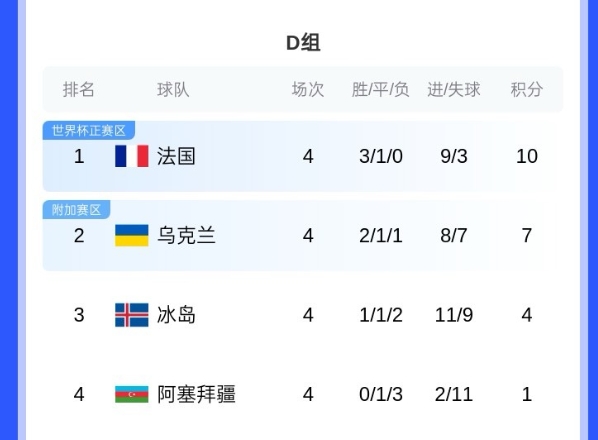 法国赢下乌克兰即可锁定小组头名晋级世界杯,若法国战平或输球,则要末轮决定直通世界杯名额。末轮法国vs阿塞拜疆,乌克兰vs冰岛。