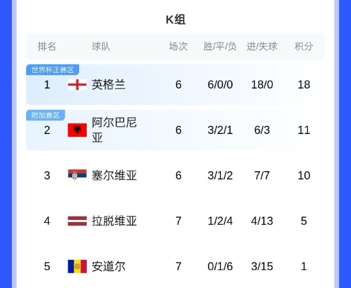 英格兰队已经提前两轮锁定了小组头名,阿尔巴尼亚和塞尔维亚将争夺小组第二的附加赛位置。本轮塞尔维亚若输英格兰且阿尔巴尼亚赢安道尔,塞尔维亚将无缘附加赛。