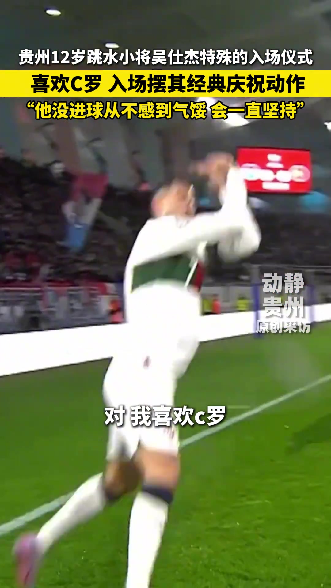 11月13日讯 贵州12岁跳水小将吴仕杰入场时模仿C罗经典庆祝动作。