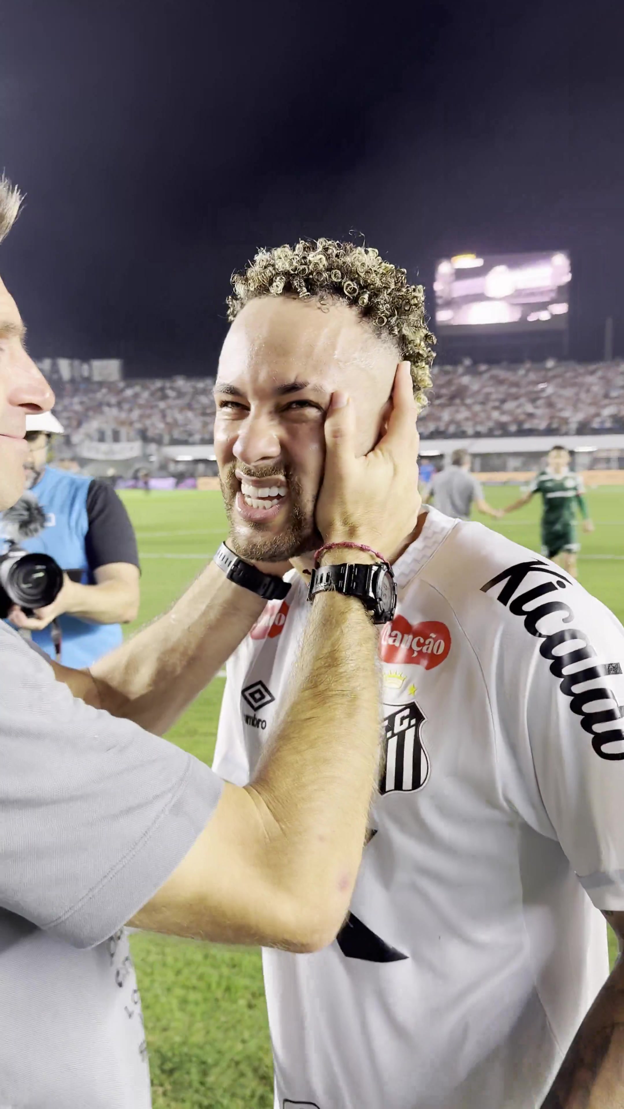 内马尔赛后与队友一一拥抱,庆祝球队取胜。