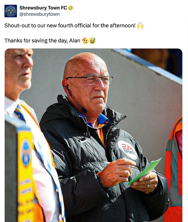 什鲁斯伯里在社媒上发布像片并写谈:“向咱们今世界午的新第四官员问候!谢谢你救场,艾伦。”