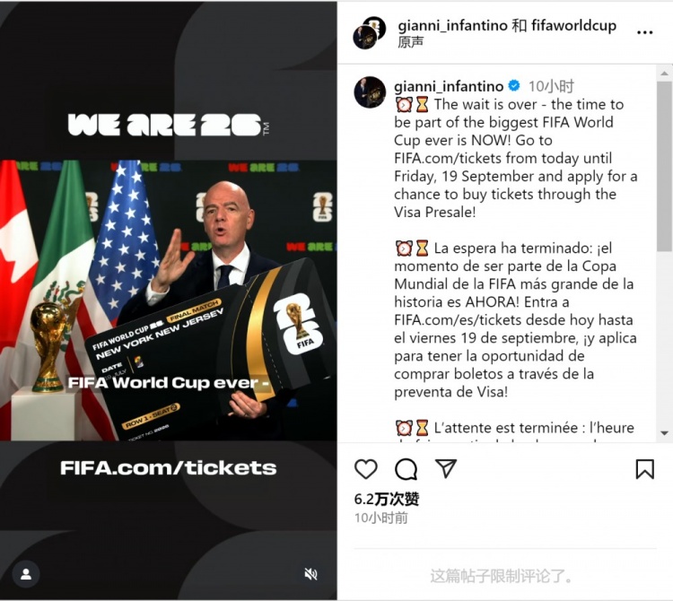 9月11日讯 海外足联主席因凡蒂诺更新社媒动态,书记全国杯球票销售行将运转。