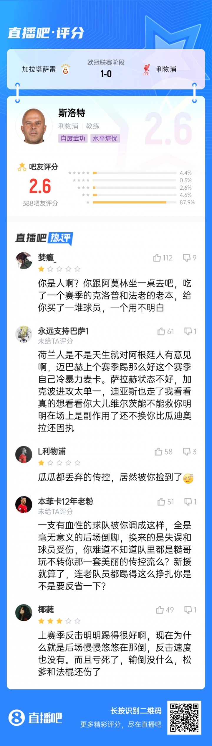 本场比赛,吧友们给斯洛特打出了2.6分的超低分。