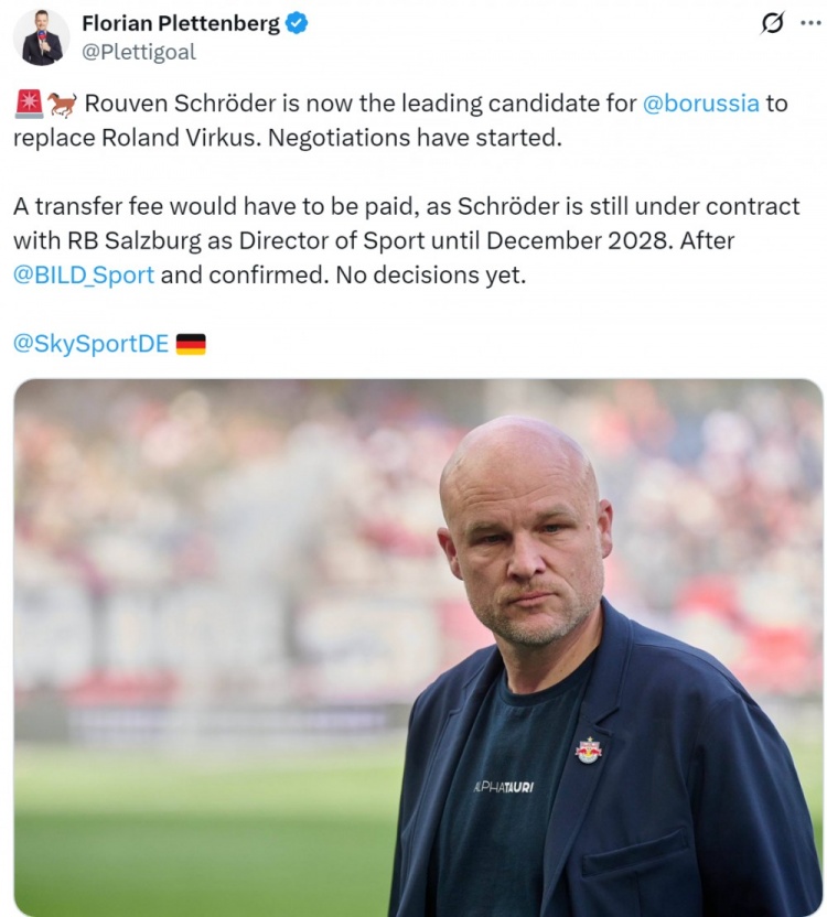 普莱滕伯格走漏,门兴正在寻找符合俱乐部的新任总监,以替代离开的维尔库斯,施罗德是头号候选,两边照旧伸开筹议。
