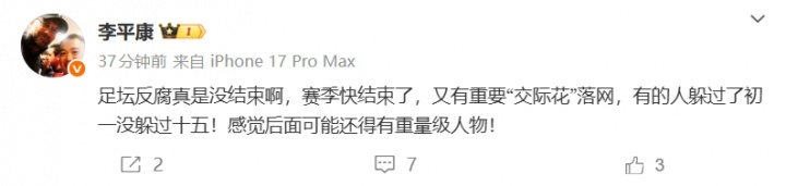 李平康:“足坛反腐确实没逼迫啊,赛季快逼迫了,又有首要“交际花”就逮,有的东谈主躲过了月吉没躲过十五!嗅觉后头可能还得有分量级东谈主物!”