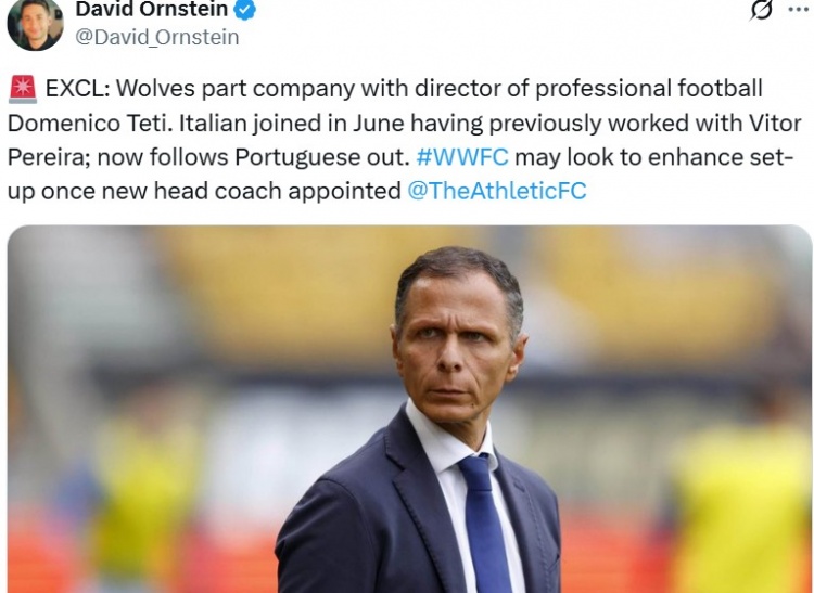 报说念称这位意大利总监于本年6月加入球队,此前曾与主帅佩雷拉同事,当今他陪同葡萄牙主帅的脚步离开了俱乐部。狼队可能会在新任主讲明笃定后进一递次整球队架构。
