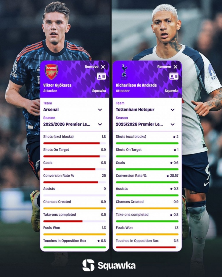 11月21日讯 英超行将战火重燃,北伦敦德比备受凝视。数据机构squakwa也对比了两队中锋约克雷斯和里沙利松本赛季英超场均关键数据情况,后者多项数据占优。