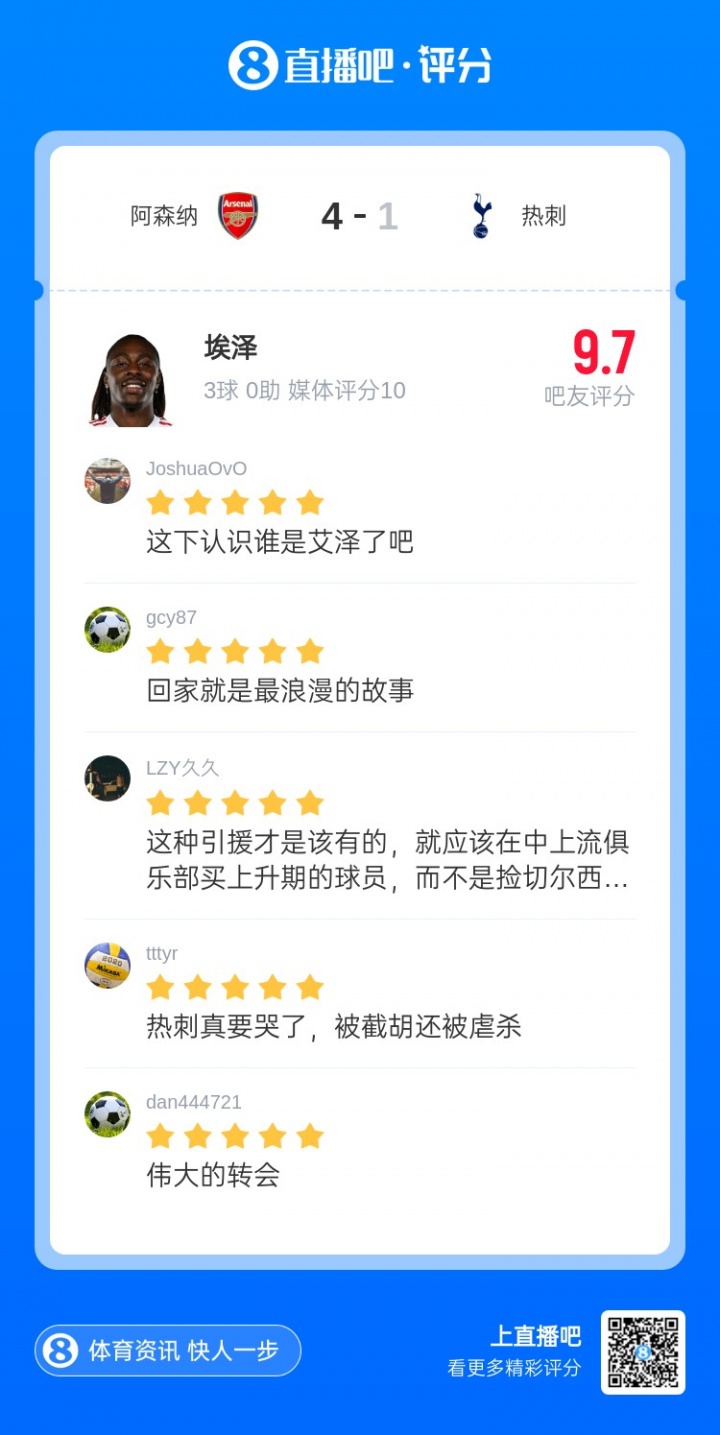 在阿森纳4-1慑服热刺的比赛中,埃泽帽子戏法带队取胜,献艺了他在加盟枪手后的最好一战。埃泽获取吧友6.8万的投票,当选【X咪咕体育英超第12轮最好球员】!