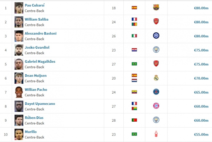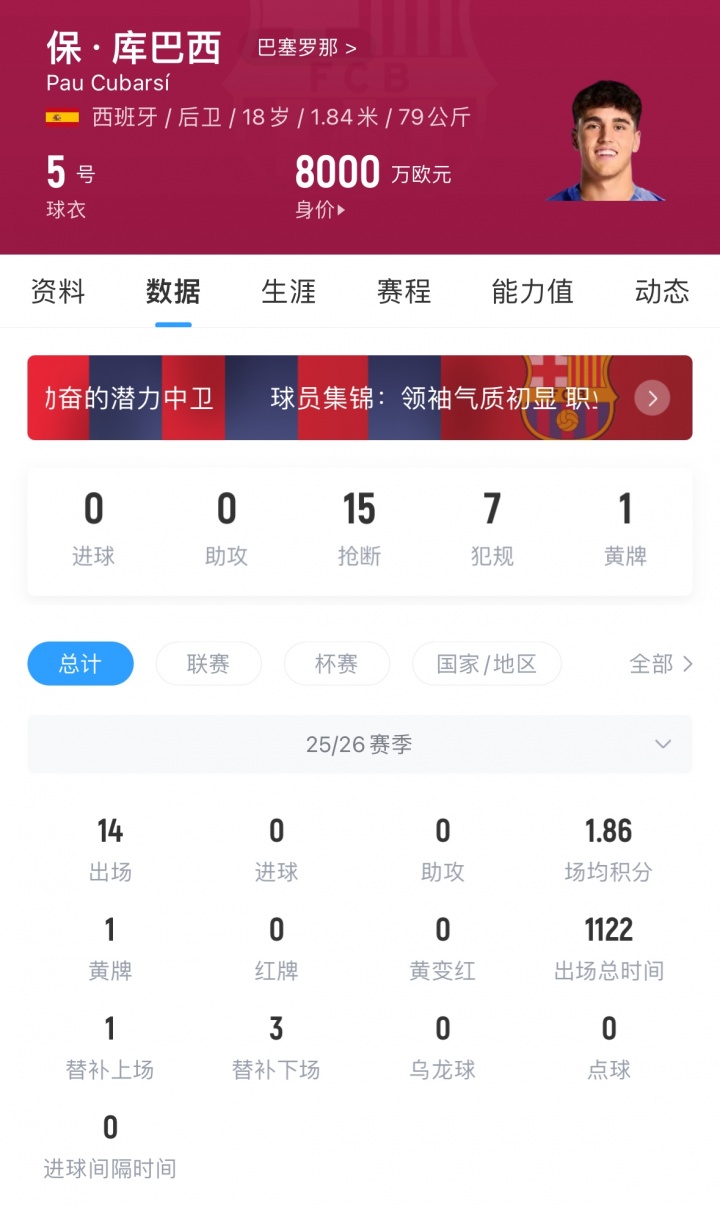 库巴西现年18岁,司职中卫,他本赛季为巴萨出场14次,现身价高达8000万,是各人后卫位置上身价最高的球员之一。