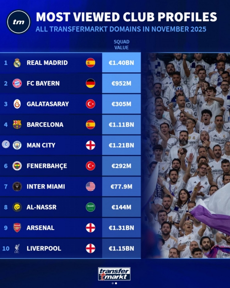 12月3日讯 德转列出了11月份俱乐部页面浏览量排行,皇马、拜仁、加拉塔萨雷前三。