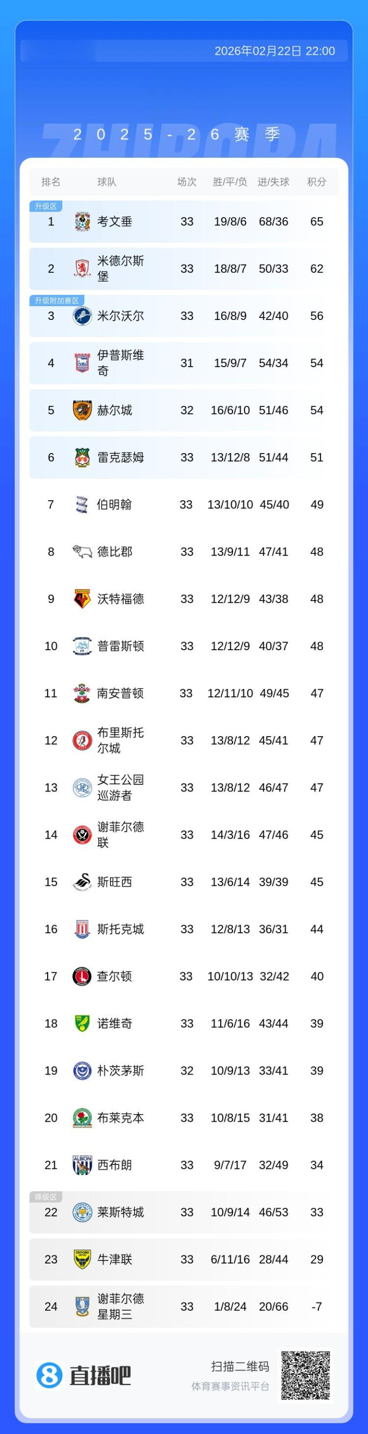 直播吧02月22日讯英冠第33轮,谢菲尔德星期三1-2不敌谢菲尔德联,33轮仅积-7分,已经追赶 降级区外的西布朗41分,提前13轮降级。