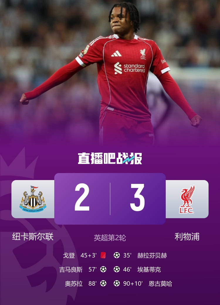 刺激!利物浦3-2十东说念主纽卡 16岁恩古莫哈100分钟绝杀埃基蒂克破门