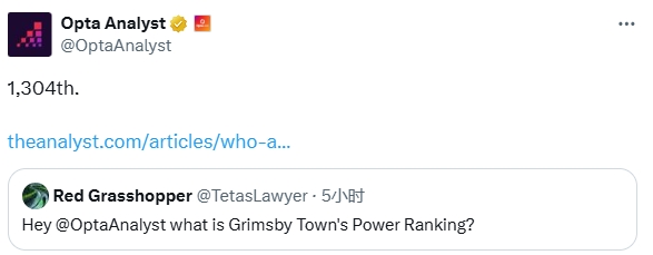有网友考虑知名数据网站OPTA,格林斯比的战力名次是若干?opta回应:第1304名。
