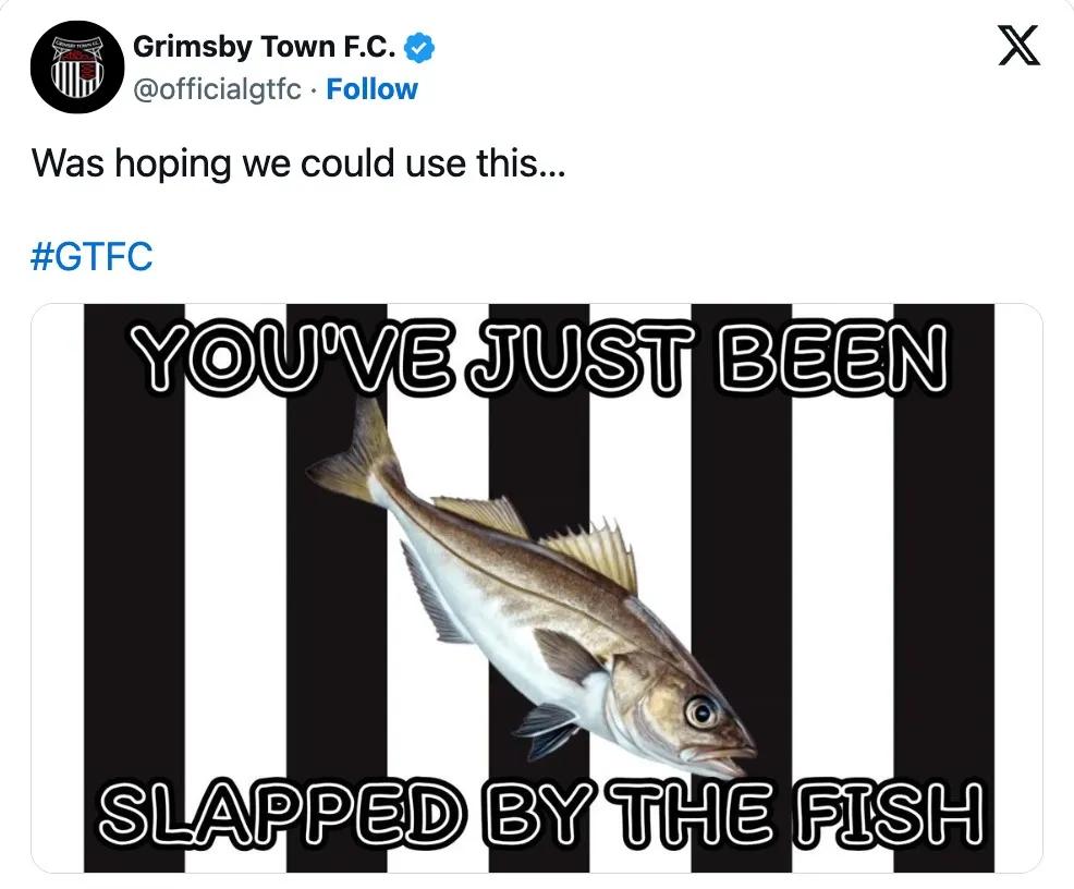 格林斯比球迷在看台放纵挥舞充气的黑线鳕鱼玩物,记挂队史最伟大的时刻。俱乐部社媒账号赛后贴出印有黑线鳕鱼的图片,写着“你刚被鱼拍了”。格林斯比是英国传统渔港,当地渔业主要捕捞黑线鳕鱼,队徽和球迷谀媚居品齐有黑线鳕鱼形象。但以曼联全场阐扬,两队谁是任东说念欺诈割的冻鱼不言自明。毕竟若非格林斯比时尚下半场阔绰了3对1的绝佳契机,曼联以至熬不到点球大战。
