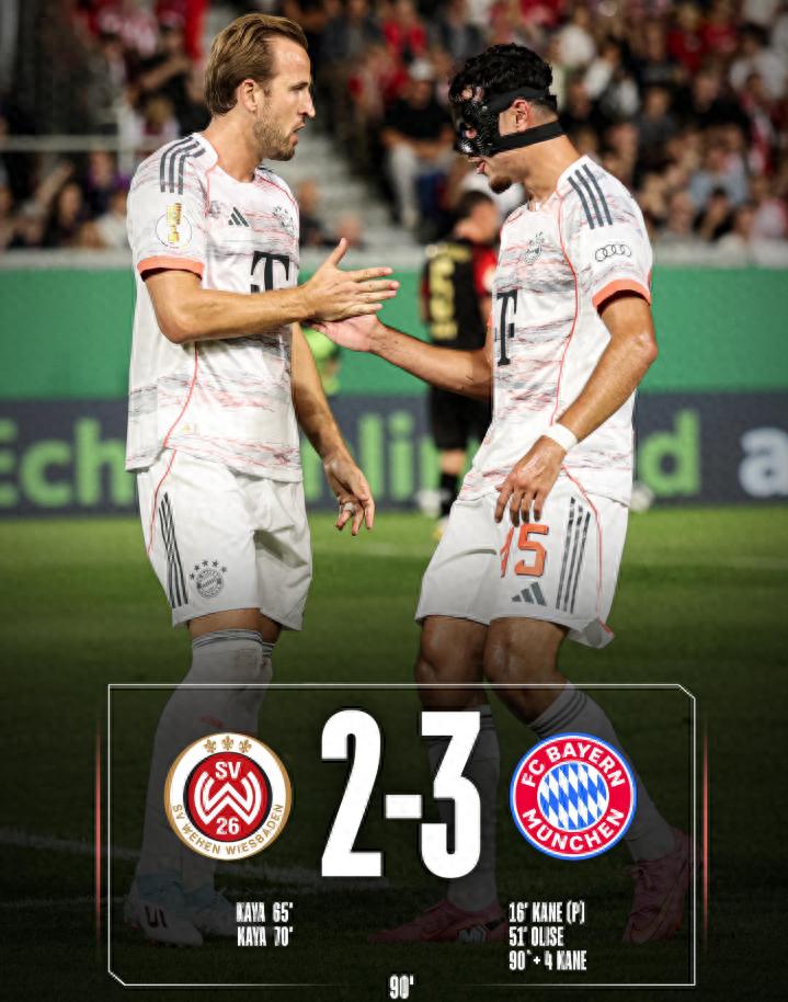 面临实力差距,主队弃取驻扎计谋,上半场仅一球落伍。下半场奥利塞低射破门扩大比分,但格雷罗和卡尔的进球因越位被取消。韦恩威斯巴登奋起反击,卡亚六分钟内连入两球扳平比分。凯恩随后创造点球却罚失,眼看比赛行将插足加时,第94分钟他头球破门完成绝杀,拜仁3比2惊恐晋级。